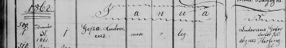 A keresztszülők Őz János és Őz Katharina voltak. Gódor Géza 1861. december 31-én születetett, és következő év legelső napján részesült a keresztség befogadó szentségében.